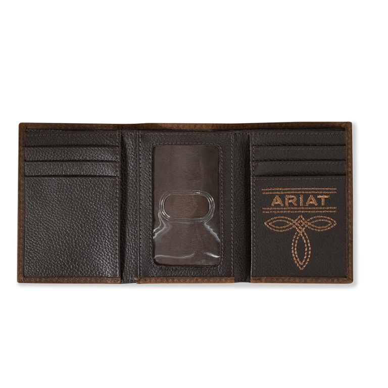 Ariat trifold wallet by M&F Western Products. This great wallet is made of genuine brown bull hide leather with a brown Ariat name and logo embroidered along the side. Slim fit design. Heavy duty stitching with multiple card slots.