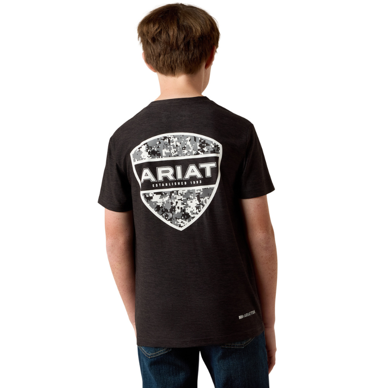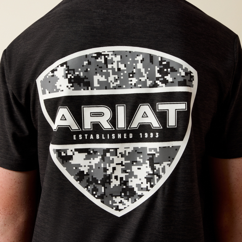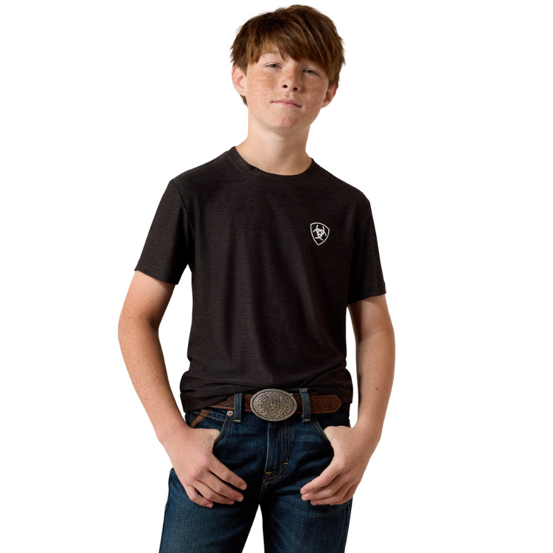 A unique spin on the best-selling Ariat® Charger tee. Just as cool, comfortable, and sweat-wicking, it has a heathered look and a bold graphic on the back.