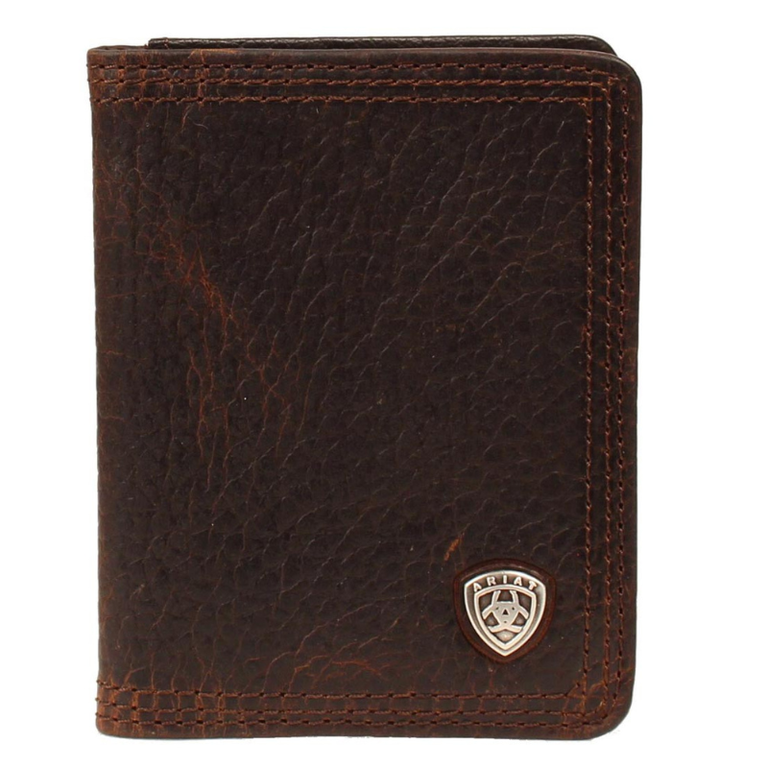This Ariat Bifold Money Clip Wallet by M&F Western Products features an oil tan dark copper leather and Ariat brand concho. Inside features a clear ID slot, credit card slots, and money slots.
