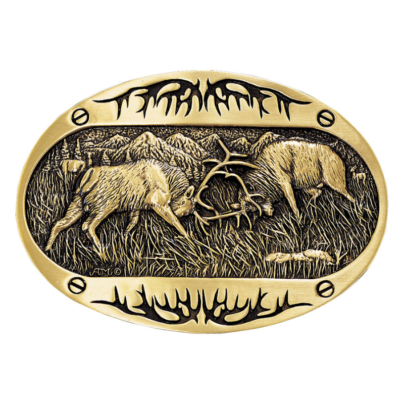 Create an accountSmall, oval cast brass Attitude belt buckle with smooth polished brass frame with four engraved screws adorn the corners for that extra attitude. Two elk stand fighting with locked horns in a detailed mountain scene while tall grass reaches up all around. Antiqued tribal scroll horns frame the scene on top and underneath. Our cast brass belt buckles are acid washed to add the dark antiqued patina and hand buffed to bring out the highlights and details. Standard 1.5 inch belt swivel.