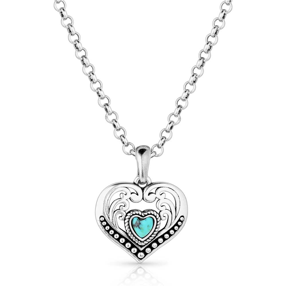 Create an accountYour love will be everlasting with the Fierce Hearts Necklace. A large open engraved heart seats a smaller heart shaped crafted turquoise stone. A beaded design lines the bottom while added black paint creates dimension. This necklace is featured on a 19 inch adjustable chain.