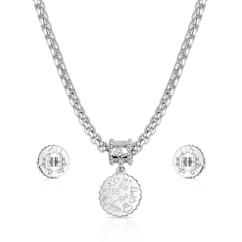Create an accountBring a touch of desert charm to your wardrobe with the Sage Creek Jewelry Set. Featuring a 17 inch silver tone cable necklace with a 3 inch extender and matching dangle earrings with secure butterfly backs, this set is designed for effortless, all day wear. The circular pendants showcase vibrant crafted turquoise stones, evoking sunlit mesas and open skies, while adding a spirited, Southwestern inspired statement to both casual ensembles and evening occasions. Stone color may vary.